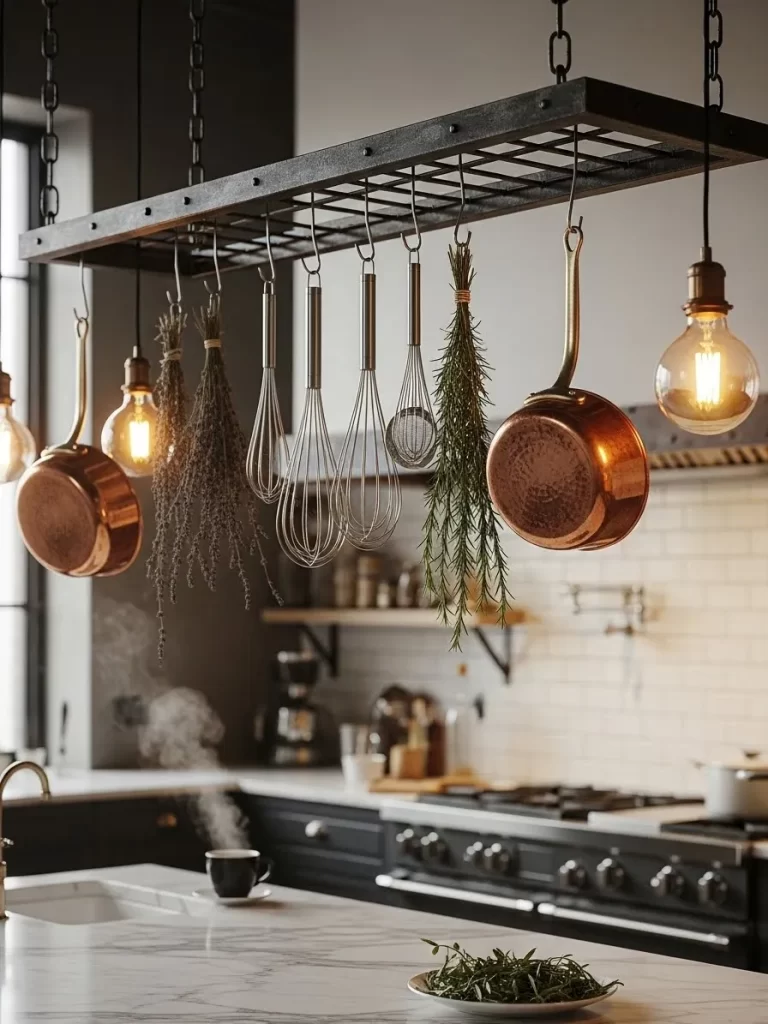Integrated lighting adds a warm glow to your preparation area, combining utility with atmosphere. Hanging your heavy pans prevents them from getting scratched in crowded drawers or cabinets. It creates a bold focal point in the kitchen while reclaiming valuable cabinet space for smaller appliances.