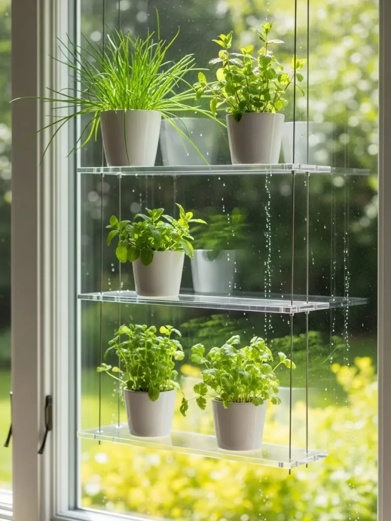 Large windows offer the best light for plants but often lack a sill wide enough for pots. This vertical hanging system uses clear acrylic shelves suspended by thin cables to create a floating garden. It allows your herbs to soak up maximum sunlight without blocking your view of the outdoors.