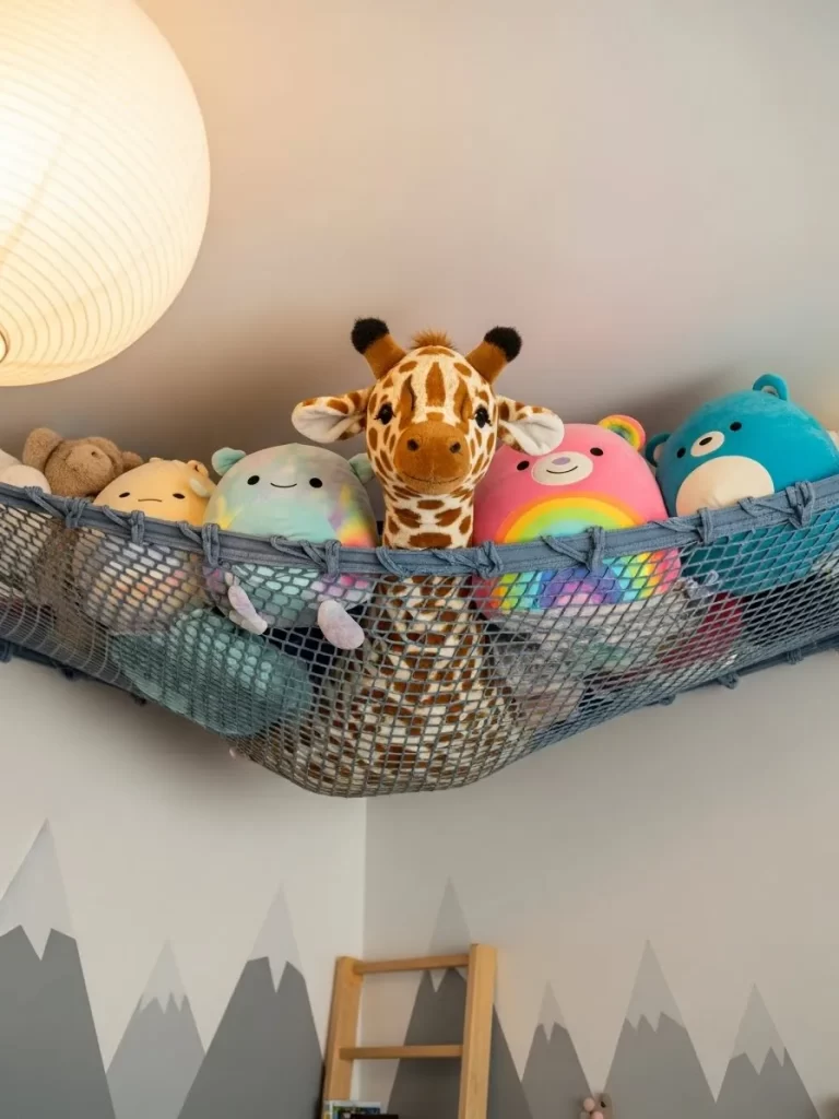 Nurseries often struggle with an overflow of soft toys that end up scattered across the carpet. This vertical corner hammock utilizes the highest point of the room to keep plushies organized and out of the way. The soft blue mesh stretches to accommodate a surprising number of stuffed animals.