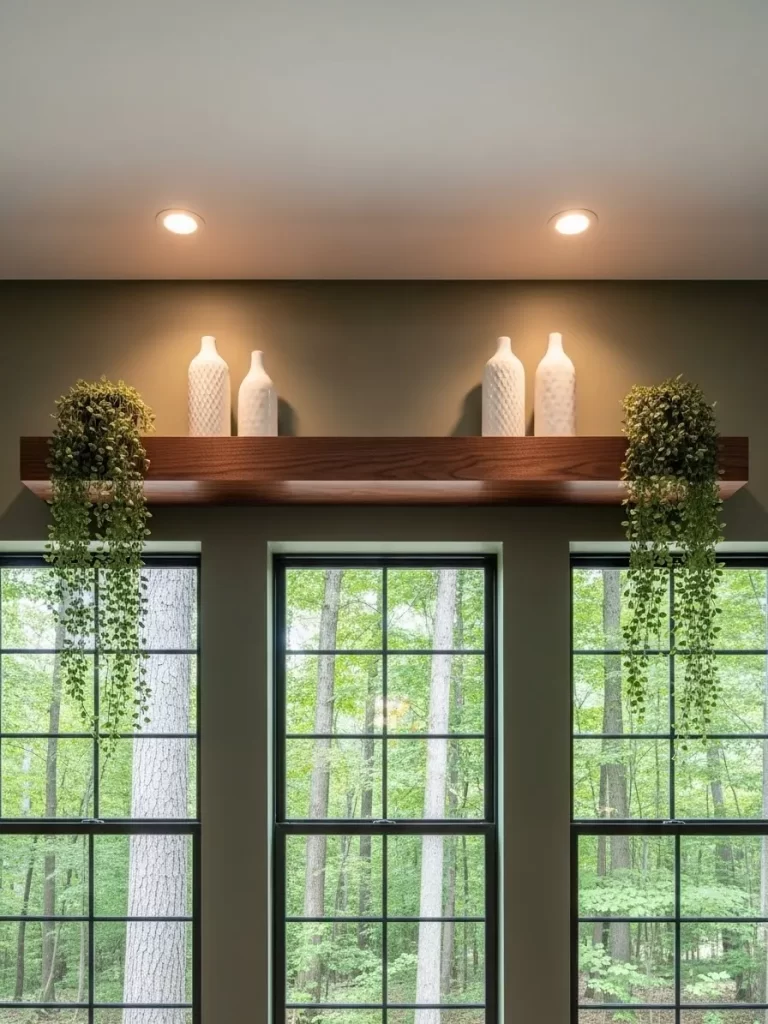 The space above a window is a prime vertical real estate that usually remains empty. This long, thick floating shelf utilizes that area to display white ceramic vases and trailing plants. The dark wood finish grounds the light coming through the window, creating a sophisticated frame for the view.