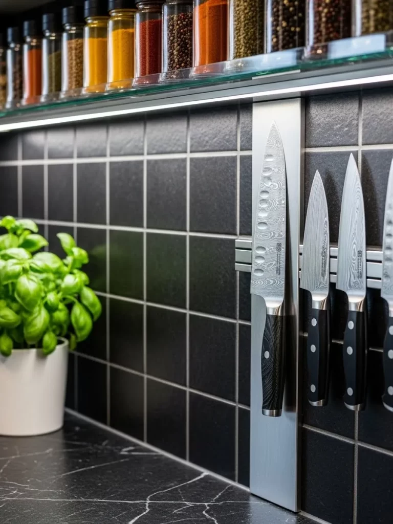 The strong internal magnets hold heavy chef knives securely in place. It prevents the moisture buildup that often occurs in traditional wooden knife blocks. This setup turns your kitchen tools into a clean visual statement while keeping your countertops completely clear for food prep.