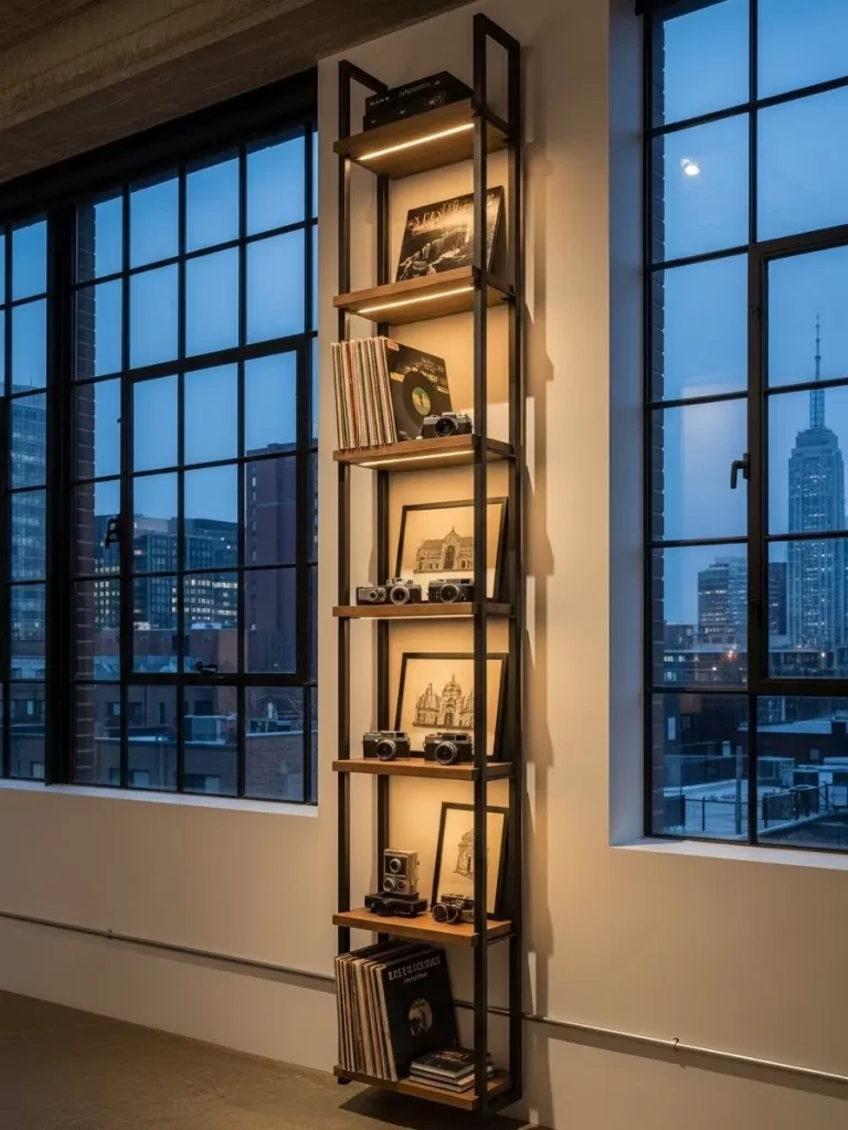 Integrated shelf lighting makes your treasures stand out, from vintage cameras to vinyl records. It is a smart way to display your personality without cluttering your main living or walking areas. This vertical unit makes a statement by filling the height of the room rather than the width.