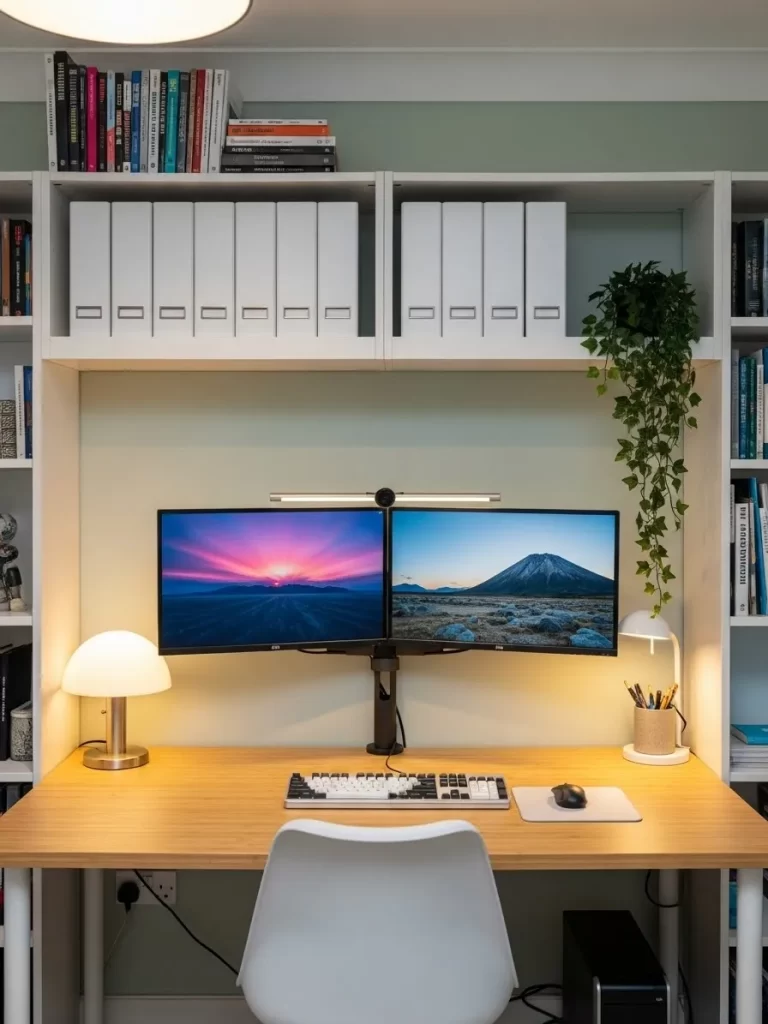 Using matching white binders keeps the visual noise to a minimum and hides messy paperwork. You can keep everything you need within arm’s reach while maintaining a clean environment. It is a complete organizational solution that turns a simple desk into a professional suite.